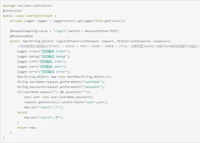 当执行com.dudu.controller.LearnController类的login方法时,LearnController 在包com.dudu.controller中,所以首先执行,将级别为“info”及大于“info”的日志信息传递给root,本身并不打印;